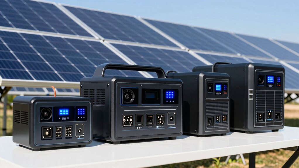 Determining your power needs is the first step in choosing the right solar generator, as it helps guarantee you select a model that can reliably run your essential devices. To do this, list all the devices you want to power and note their wattage. Next, calculate how many hours you’ll use each device daily. Keep in mind that a larger solar panel can recharge the battery faster, but a bigger battery offers longer battery life during cloudy days or extended use. Incorporating attention to detail during this process ensures you accurately assess your requirements and avoid over or underestimating your power needs.