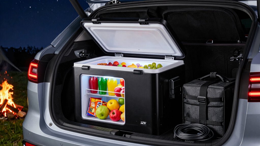 Setting up a 12V fridge is like giving your vehicle a portable kitchen on wheels, perfect for adventures or road trips. Whether you’re camping or just on the go, choosing the right setup guarantees your food stays fresh and your drinks cold. With a little planning, your 12V fridge becomes as reliable as your favorite travel companion, making every trip more comfortable and enjoyable. So, gear up and hit the road—freshness is just a setup away.