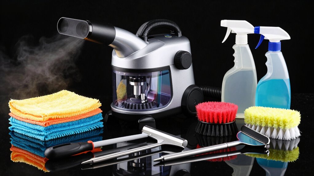 A versatile handheld vacuum is another essential tool that can drastically cut down on cleaning time. Modern models come with powerful suction and multiple attachments, letting you quickly clean upholstery, carpets, vents, and tight spaces. Instead of dragging out bulky vacuums or manually sweeping, you can zip through interior cleaning in minutes. Pair this with microfiber cloths that trap dust and dirt efficiently, and you’ll find your interior detailing becomes much faster and more thorough. The quick-drying nature of these cloths means you won’t have to wait long before the interior is ready to use again. Incorporating innovative cleaning tools can further enhance efficiency and ensure your vehicle is spotless in less time. Utilizing specialized cleaning equipment can also optimize your entire interior cleaning process, making it even more efficient.