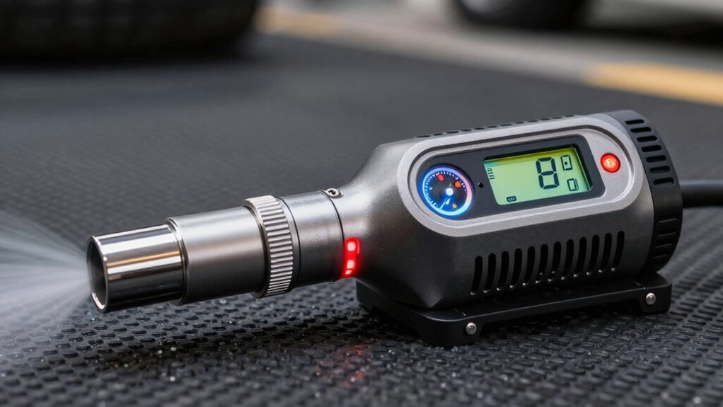 If your tire inflator keeps overheating, it’s likely because you’re exceeding its duty cycle, which is how long it can run continuously without needing a break. Running it at high PSI or in hot environments also causes heat buildup. To prevent this, follow the manufacturer’s recommendations, incorporate cooling periods, and make certain proper ventilation. Keep in mind that choosing the right model and maintaining it properly can help you avoid overheating issues—more tips ahead.