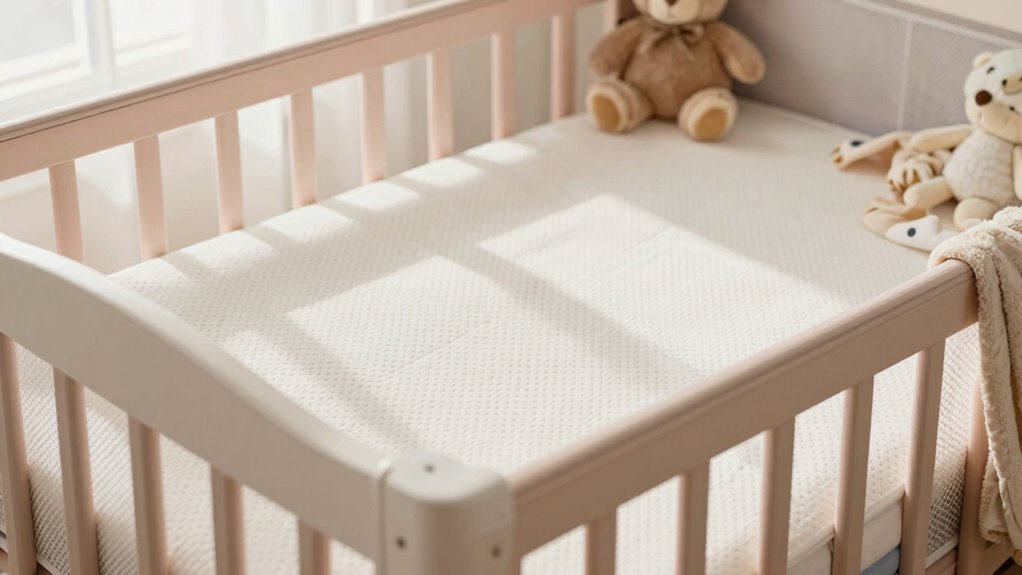 Breathable crib mattresses are designed to improve airflow and reduce the risk of suffocation, making them a safer choice for your baby. The breathability benefits stem from materials that allow air to circulate through the mattress, helping to keep your baby cool and dry. Many marketing claims highlight these features as a way to lower the risk of Sudden Infant Death Syndrome (SIDS), but it’s essential to understand how they work. These mattresses often incorporate breathable fabrics or mesh sides that promote ventilation. Unlike traditional foam mattresses, breathable options aim to prevent heat and moisture buildup. Additionally, material composition plays a crucial role in the effectiveness of the breathability features. While marketing claims emphasize safety, it’s vital to evaluate the actual design and materials used to determine if the breathability benefits are genuine and effective for your baby’s well-being. Understanding the innovative materials used can help differentiate between effective features and marketing hype. Furthermore, knowing how certifications and standards relate to safety can guide you in making informed choices about these mattresses.