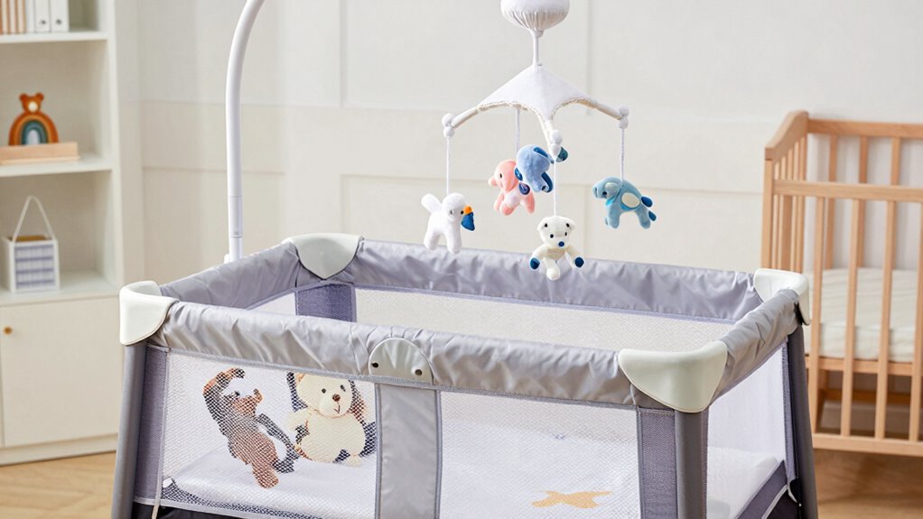 Adding a mobile or toys inside your pack and play is like decorating a safe stage for your little one. Stick to securely attached, age-appropriate mobile toys and avoid decorative mobiles that hang loose or have small parts. Make sure they’re sturdy and won’t fall or pose a choking hazard. Always follow manufacturer guidelines, and regularly check for wear and tear. Safety first keeps playtime fun and worry-free.
