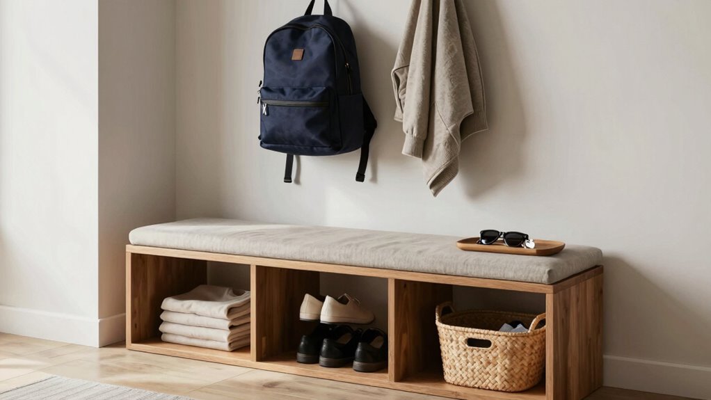 You can customize your entryway bench setup with affordable DIY decor and budget upgrades. Use paint or contact paper to give the bench a fresh look, or add inexpensive storage baskets for organization. Repurpose items like vintage crates or thrift store finds to create personalized touches without breaking the bank. These simple DIY decor ideas and budget upgrades make your drop zone functional and stylish, inviting family members to maintain it easily.