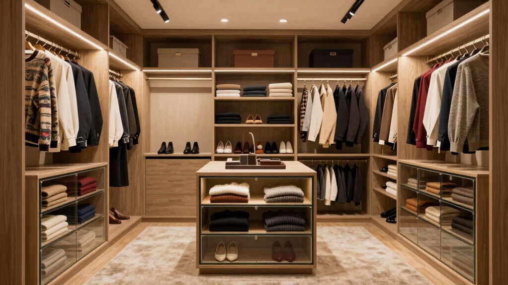 This setup reduces clutter, enhances organization, and makes it easy to maintain your closet’s neat appearance. With clear zones, you’ll save time each day and keep your clothing categorization on point, making your walk-in closet a functional and stylish space.