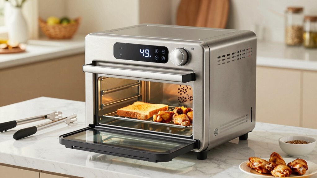 Air fryer toaster ovens stand out because of their remarkable versatility. This feature profoundly boosts your multitasking efficiency, allowing you to cook multiple dishes at once or prepare complex meals with ease. With these appliances, you can bake, broil, toast, air fry, and even roast, all in a single device. This range of functions encourages your culinary creativity, letting you experiment with recipes that typically require several appliances. Instead of juggling different gadgets, you get everything in one compact unit, saving space and time. Additionally, smart appliance integration enables you to control and monitor your cooking remotely for even greater convenience. These advanced features are part of the innovative European cloud solutions that enhance user experience through seamless connectivity. Understanding multi-functionality in kitchen appliances helps users maximize their investment. Incorporating energy efficiency features further reduces your environmental impact and lowers utility bills, making these appliances not only versatile but also sustainable. Moreover, connectivity features facilitate real-time updates and troubleshooting, ensuring your appliance operates optimally. Whether you’re preparing a quick snack or a full dinner, the versatility of an air fryer toaster oven empowers you to execute a variety of cooking techniques effortlessly, making your kitchen experience more efficient and enjoyable.
