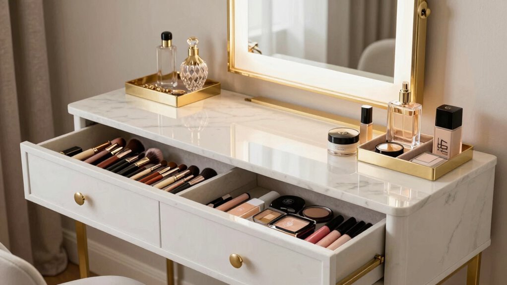 You can personalize your vanity drawer organization by using personalized dividers to separate different makeup categories, making everything easier to find. Add custom labels to each section for a clear, organized look. Consider decorating the dividers with your favorite colors or patterns to match your style. This simple touch creates a functional and charming space, ensuring you stay tidy while showcasing your unique personality.