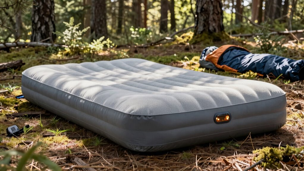 Choosing the right camping air mattress is like finding a cozy cloud in the woods. By considering thickness, R-value, noise levels, and key features, you’ll guarantee restful nights under the stars. Remember, the perfect mattress isn’t just about comfort—it’s about turning outdoor sleep into a peaceful escape. So, pick wisely, inflate confidently, and let your camping adventures be filled with sweet dreams, not sleepless nights. After all, the best memories start with a good night’s sleep.