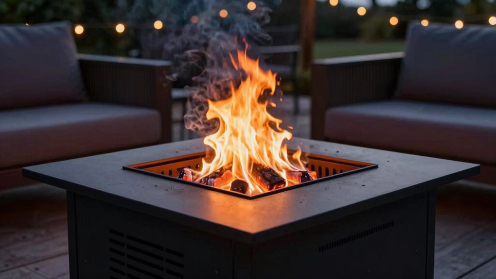 A smokeless fire pit is designed to reduce the amount of smoke produced during a fire, making it more enjoyable and less disruptive. It achieves this by improving combustion efficiency, which enhances fire safety by minimizing smoke inhalation and reducing the risk of accidental fires. These fire pits typically use specific fuel types, such as hardwood or specially designed pellets, to guarantee cleaner burning. Unlike traditional pits, smokeless models incorporate features like built-in vents or secondary combustion chambers that help burn off smoke particles before they escape. These features not only improve air quality but also contribute to more efficient fuel use. While they notably cut down on smoke, they still require proper fire safety measures, including safe fuel handling and keeping flammable materials away. Additionally, the effectiveness of a smokeless fire pit can depend on proper ventilation and maintenance to ensure optimal performance. Regular cleaning of the internal components helps maintain combustion efficiency and prolongs the lifespan of the fire pit. Ensuring the correct fuel type is used is crucial for achieving the best smoke reduction results. Proper fire safety protocols are essential for safe outdoor enjoyment. Overall, they offer a safer, cleaner way to enjoy a cozy fire outdoors.