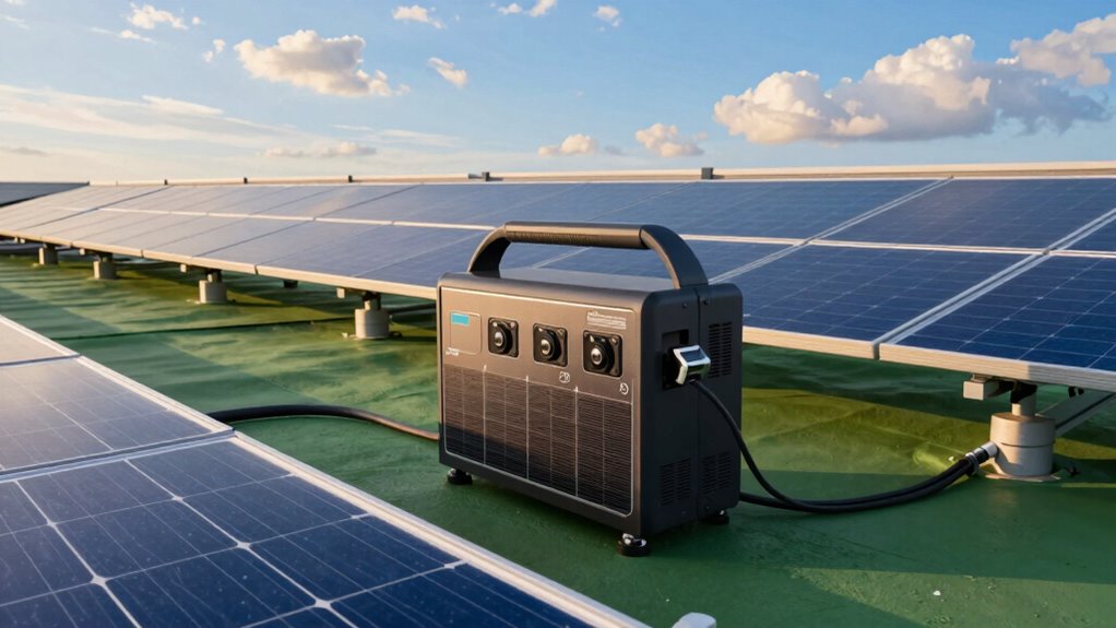 Ever wondered how the arrangement of your solar panels influences charging times? Your solar panel installation plays a pivotal role in maximizing sunlight capture, directly affecting how quickly your battery charges. Proper panel placement, such as ideal angles and spacing, ensures each panel receives maximum sunlight without shading. A well-arranged setup can greatly improve overall efficiency, reducing the time needed to recharge your solar generator. Additionally, consistent and efficient charging helps preserve battery longevity by avoiding excessive cycling or partial charges. Keep in mind that larger panels aren’t always better if they’re poorly positioned. Focus on strategic panel arrangement to maximize sunlight exposure, which results in faster charging and extends the lifespan of your battery system. Proper setup is key to a reliable, fast-recharging solar generator.