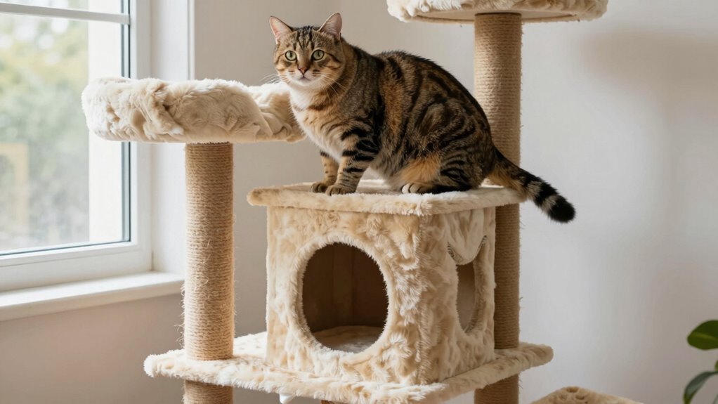 Ensuring your cat tree is set up for maximum stability begins with careful placement. Position it on a flat, level surface away from high traffic areas to prevent accidental bumps. Consider the cat tree aesthetics by choosing a spot that complements your decor while maintaining balance. Secure the base to the floor or wall if possible, using sturdy brackets or straps to prevent wobbling. Check that all pet safety features, like non-slip pads or locking mechanisms, are in place and functioning correctly. Avoid placing the tree near windows or furniture that could tip over if your cat jumps or climbs vigorously. Proper setup not only keeps your big cats safe but also ensures the tree remains stable and durable over time.