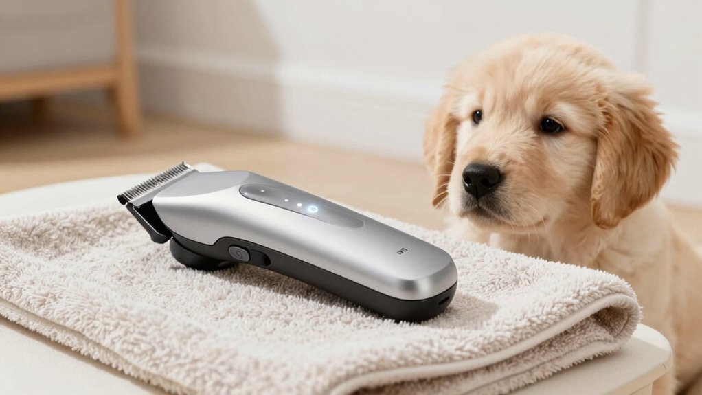 Choosing quiet, beginner-friendly dog grooming clippers for home use is vital because they make grooming sessions more comfortable for both you and your pet. Low noise levels help reduce your dog’s stress and prevent anxiety during clipping. When clippers operate quietly, your pet is less likely to become frightened or resistant, making grooming smoother. Additionally, an ergonomic design is indispensable, as it ensures a comfortable grip and better control, reducing hand fatigue during longer grooming sessions. With easier handling and less noise, you can create a calm environment that encourages your dog to stay still. Furthermore, noise levels of fans measured in sones can serve as a useful reference for understanding how quiet certain grooming tools may be. This is especially important for Free Floating breeds that are more sensitive to noise. Incorporating connected grooming technology can also help monitor your dog’s comfort levels and improve the overall grooming experience. Selecting clippers with professional-grade motors ensures durability and efficient performance, making grooming safer and more effective. Additionally, considering energy-efficient components can contribute to a more sustainable grooming routine by reducing power consumption. Overall, selecting clippers with low noise levels and an ergonomic design helps make grooming a positive experience, fostering trust and simplifying your routine.