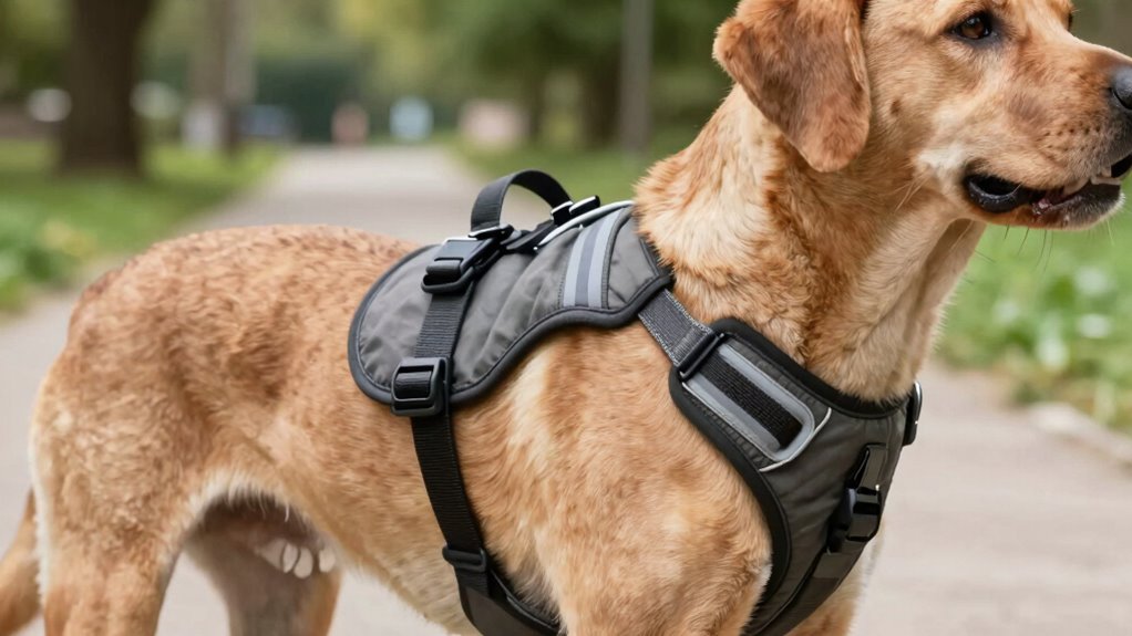 A well-fitted harness can considerably prevent injuries during walks. For example, imagine you’re walking your dog, and a harness distributes pulling force evenly across the chest and shoulders, reducing strain on the neck. Proper fit guarantees comfort and injury prevention, especially for active pullers. By choosing a harness that fits snugly without chafing, you protect your dog from potential injuries and make walks safer and more enjoyable for both of you.