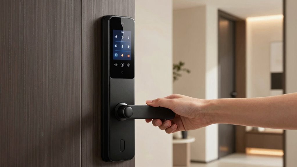 No-drill smart locks use innovative installation methods that won’t harm your door or leave permanent marks. Many options are damage-free, making them perfect for renters who want flexibility. It’s also important to check their compatibility with your door type to guarantee a smooth fit. When selecting a smart lock, consider those that are rated highly for security reliability and that integrate seamlessly with your existing smart home devices.