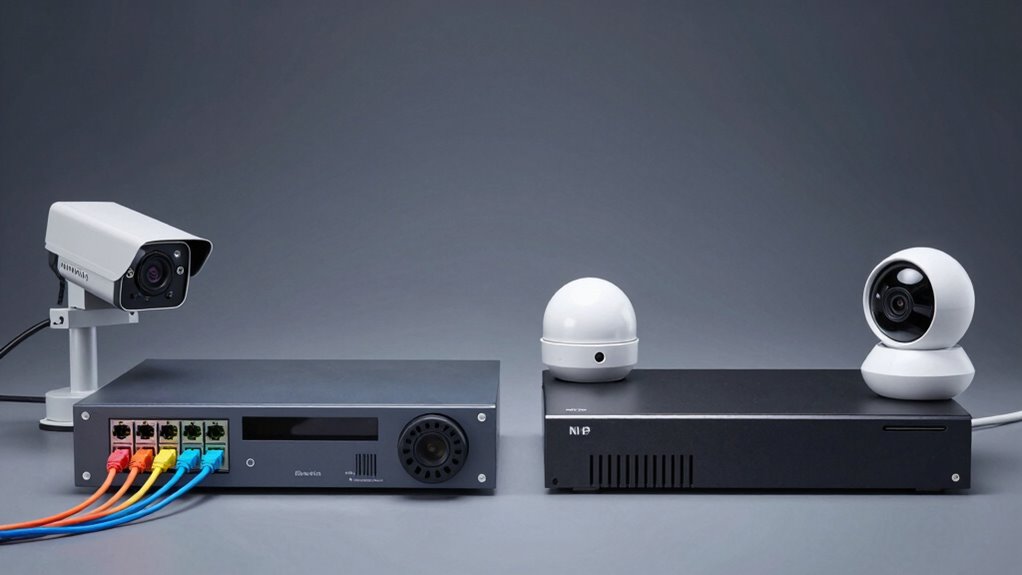 Choosing between a DVR and an NVR depends on your security needs. DVRs use analog signals via coaxial cables and are often more affordable, but they offer lower resolution and less flexibility. NVRs transmit digital signals over Ethernet cables, supporting higher resolution, remote access, and easier system expansion. If you want a scalable, future-proof setup, an NVR is generally better. Keep exploring to find out which system suits your specific surveillance requirements.