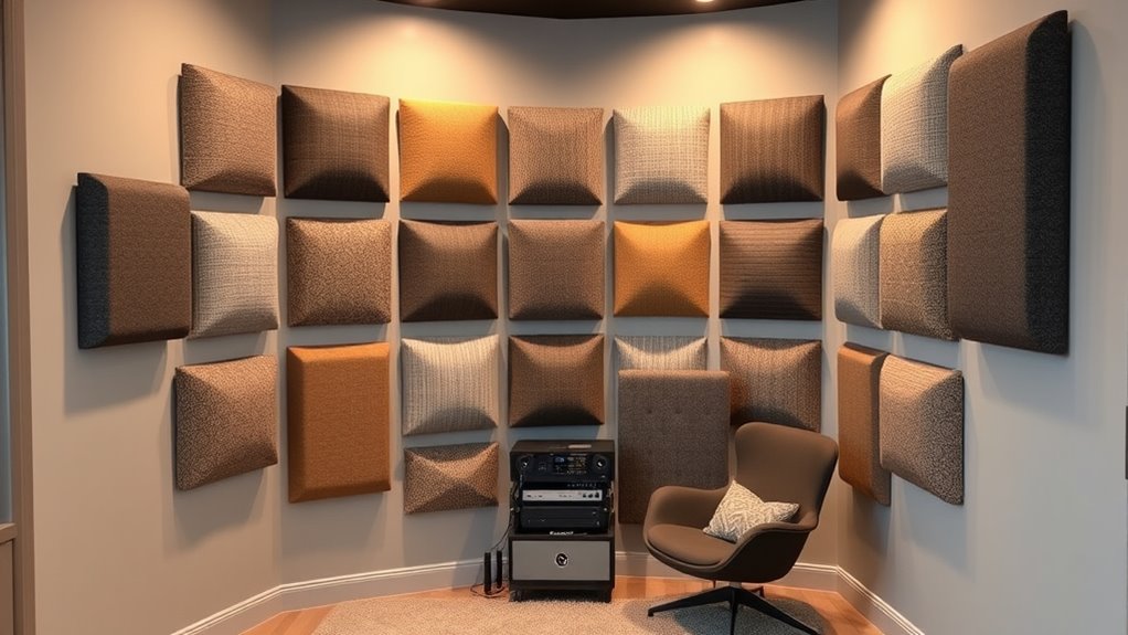 Budget considerations play a significant role in selecting the right acoustic panels for your home studio. Prices vary widely; basic foam panels start around $20 for a pack, while high-end designer options can exceed $200. Cheaper foam panels often use lower-density materials, which may be less durable and less effective over time. Investing in higher-quality panels with better NRC ratings might cost more upfront but can save money long-term through improved sound absorption and durability. Buying in bulk can lower the cost per panel, especially for larger studios. Don’t forget additional expenses like adhesives, installation tools, or framing, which can add to your overall budget. Balancing your needs and resources guarantees you get the best value without overspending.