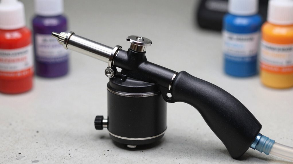 Think of your airbrush and compressor as a delicate dance partner—you need to keep them clean and cared for. I regularly flush the airbrush with cleaning solution after each use, ensuring no paint clogs the tiny nozzle. For the compressor, I wipe down surfaces and drain moisture from the tank. Proper maintenance keeps the tools humming smoothly, so your artwork always flows effortlessly and beautifully.