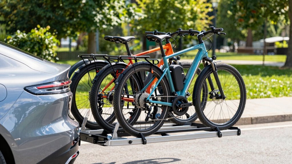 To guarantee your e-bikes stay secure during transit, it’s vital to take into account the security features of your hitch bike rack. Locks on frame clamps and wheel cradles prevent theft and keep bikes from falling off. Anti-theft straps and lockable ratchet systems add extra protection by securing bikes to the rack and stopping unauthorized removal. Incorporating locking hitch pins ensures the entire rack stays attached to your vehicle, even if someone tries to detach it. Some racks feature integrated cable locks or lockable hooks for individual bikes, boosting security further. Reinforced materials and tamper-proof fasteners also help guard against theft and vandalism. These features give you peace of mind, knowing your e-bikes are well-protected during transport.