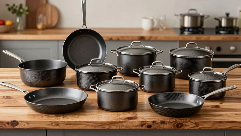 When choosing a carbon steel cookware set, I consider factors like material quality, size options, and how well it works with my stove. I also look at how the non-stick surface develops over time and how easy it is to maintain. These points help guarantee I pick cookware that fits my cooking style and lasts long.