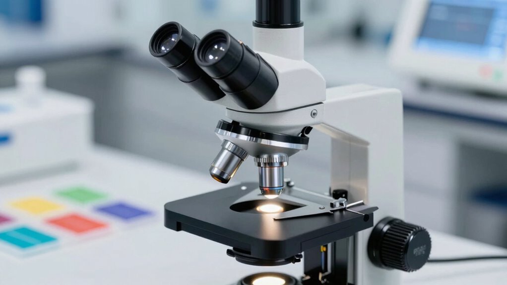 Good illumination is crucial for getting the most out of your compound microscope, as it directly impacts image clarity and contrast. A high-quality microscope should have adjustable LED lighting with dimming controls, allowing you to set the perfect brightness for different specimens. Dual illumination systems, combining incident and transmitted light, provide versatility for observing both opaque and transparent samples. Consistent, even lighting is essential, which is achieved through well-designed condensers and stable light sources, reducing glare and shadows. Adjustable brightness controls let you fine-tune the light intensity, enhancing contrast and revealing intricate details. Reliable illumination systems with durable components and stable power sources ensure consistent performance during extended use. Prioritizing these features helps you achieve ideal viewing conditions for various specimens.