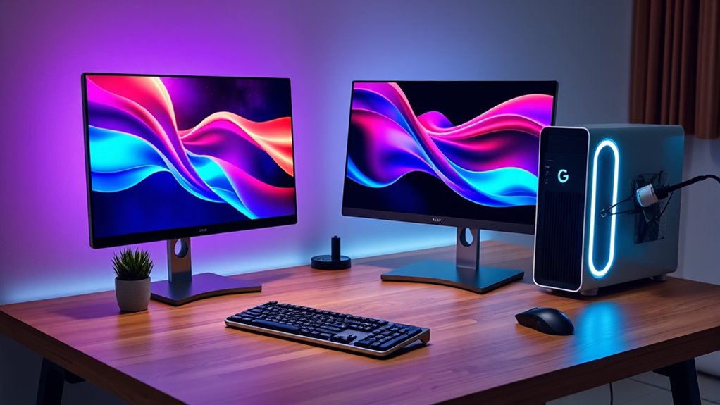 To guarantee your home office runs smoothly, it’s crucial to prioritize connectivity features in your desktop PC. I look for multiple USB ports, including Type-A and Type-C, to connect keyboards, mice, and external drives effortlessly. Built-in Wi-Fi, preferably Wi-Fi 6 or 5G, ensures fast, reliable internet without cluttering my workspace. Bluetooth capability is essential for wireless accessories like headphones and printers, keeping my desk tidy. An Ethernet port provides a stable, high-speed wired connection when needed. Additionally, support for modern display outputs such as HDMI, DisplayPort, or VGA helps me connect multiple monitors for increased productivity. These connectivity features collectively ensure seamless communication, data transfer, and an efficient workflow in my home office setup.