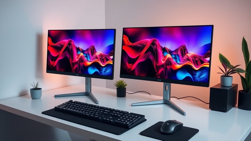 Ergonomic adjustability features are essential for creating a comfortable and healthy dual monitor setup. They allow me to customize the monitor position for ideal comfort, reducing strain during long hours. Features like height, tilt, swivel, and pivot enable precise adjustments to find the perfect viewing angle. Monitors with VESA compatibility are particularly helpful, offering flexible mounting options to suit my workspace. An adjustable stand with multiple tilt and height settings helps me maintain proper eye level and posture, preventing neck and back pain. Quick-release mechanisms and tool-less adjustments make customization simple and accessible. Supporting ergonomic features not only enhances comfort but also boosts productivity by promoting healthy habits and reducing fatigue during extended use.