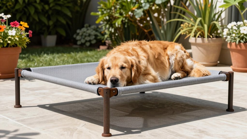 Since outdoor conditions can be unpredictable, choosing an elevated cooling dog bed made with weather-resistant materials that can handle rain, sun, and temperature changes is essential. These beds are crafted from durable fabrics like Teslin mesh or HDPE, which resist water, moisture, and UV damage, ensuring they won’t degrade quickly. The frames are typically rust-proof or corrosion-resistant, using powder-coated steel or stainless steel to withstand the elements. Features like quick-drying surfaces and removable, washable covers help maintain hygiene regardless of weather. Non-slip, weatherproof feet or pads provide stability on wet or uneven surfaces, preventing slips. Overall, these beds are designed to endure outdoor exposure, making them reliable options for year-round outdoor use.