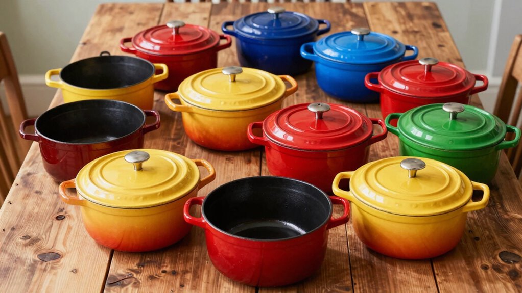 If you’re searching for the 15 best enameled cast iron Dutch ovens for 2026, I’ve got you covered. These pots combine durability, even heat, and eye-catching designs in sizes from 4QT to 7.5QT, perfect for everything from small stews to large roasts. With features like easy-to-clean surfaces and stylish colors, they suit any kitchen. Curious about which one fits your needs? Keep exploring to find out more about these top choices.