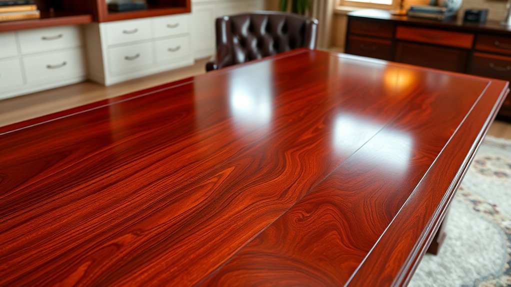 Think of your desk as a precious sculpture; I prevent scratches and dents by treating it like a work of art. I use coasters, placemats, and felt pads under items to avoid direct contact. Regularly cleaning with gentle products and applying a protective polish keeps the wood resilient. I also avoid placing hot or sharp objects directly on the surface, ensuring my desk remains a timeless masterpiece.