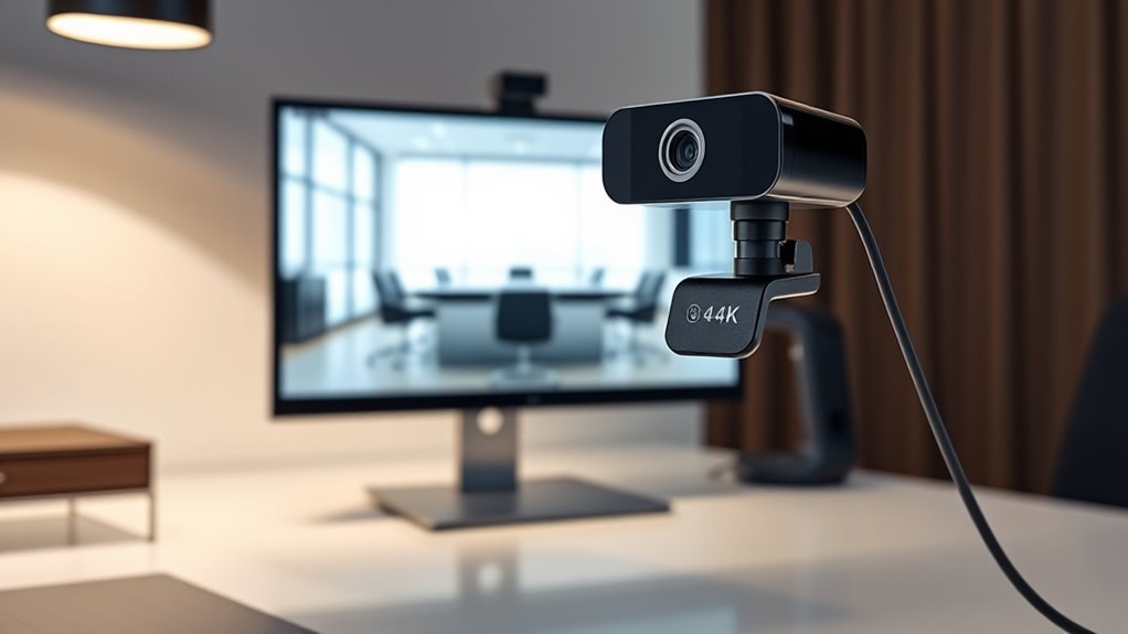Choosing the right external webcam for 4K meetings involves more than just looking at resolution specs. While 4K offers four times the pixel count of 1080p, resulting in sharper, more detailed video, resolution alone doesn’t guarantee quality. The sensor type, usually CMOS, impacts sensitivity and low-light performance, which are critical for clear images. It’s also important to contemplate lens quality and whether the webcam can switch between resolutions to adapt to bandwidth or hardware limitations. High-quality compression, proper lighting, and a powerful processor work together to prevent lag and buffering. Ultimately, a webcam’s resolution should complement these factors, ensuring your video remains crisp, smooth, and professional during meetings.