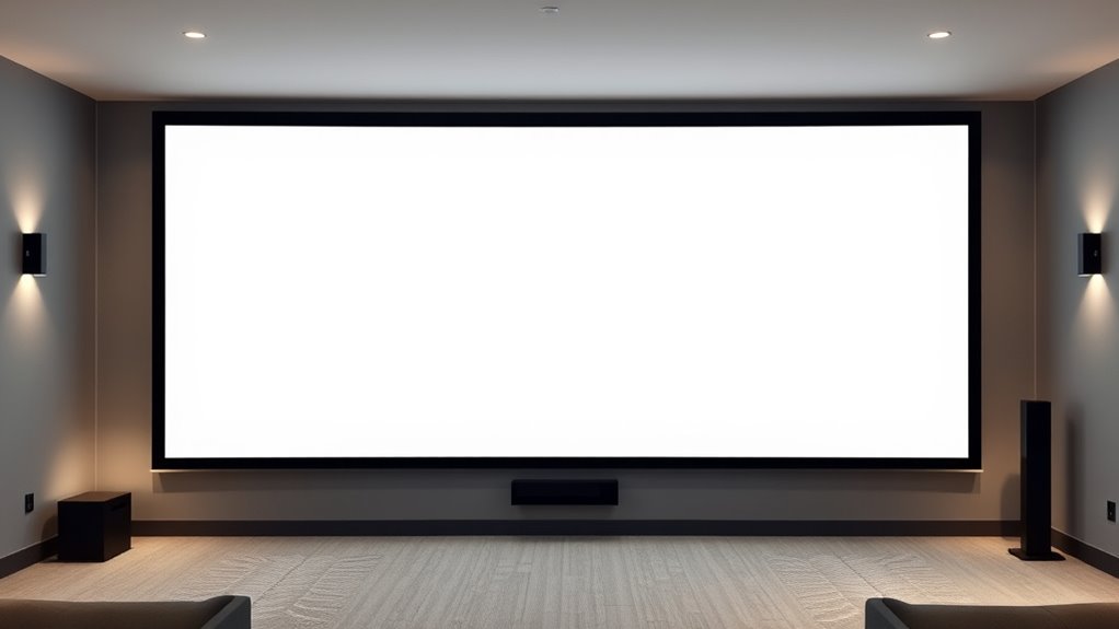 Light rejection features are essential for ensuring a clear, vibrant picture, especially in rooms with ambient light. These features help minimize interference from surrounding light sources, boosting contrast and image clarity. High contrast ALR (Ambient Light Rejection) screens can reject up to 70% of ambient light, making visuals pop even in bright environments. Matte or specialized reflective surfaces with light rejection properties reduce washout and glare, providing consistent brightness across the screen. Many screens incorporate optical coatings or materials designed to absorb or deflect stray light, markedly improving overall picture quality. Effective light rejection is vital for maintaining high contrast ratios and vibrant colors, ensuring your viewing experience remains sharp and vivid despite ambient lighting challenges.