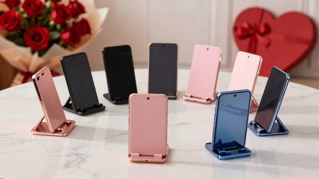 If you’re looking for the best foldable phone stands for Valentine’s in 2026, I’ve got you covered. There are stylish options like heart-shaped acrylic stands, ultra-portable sets of three, and adjustable designs suitable for any device size. These stands are compact, durable, and perfect for everyday use or gifting. Keep exploring, and you’ll discover how these versatile options can make your moments more convenient and romantic.