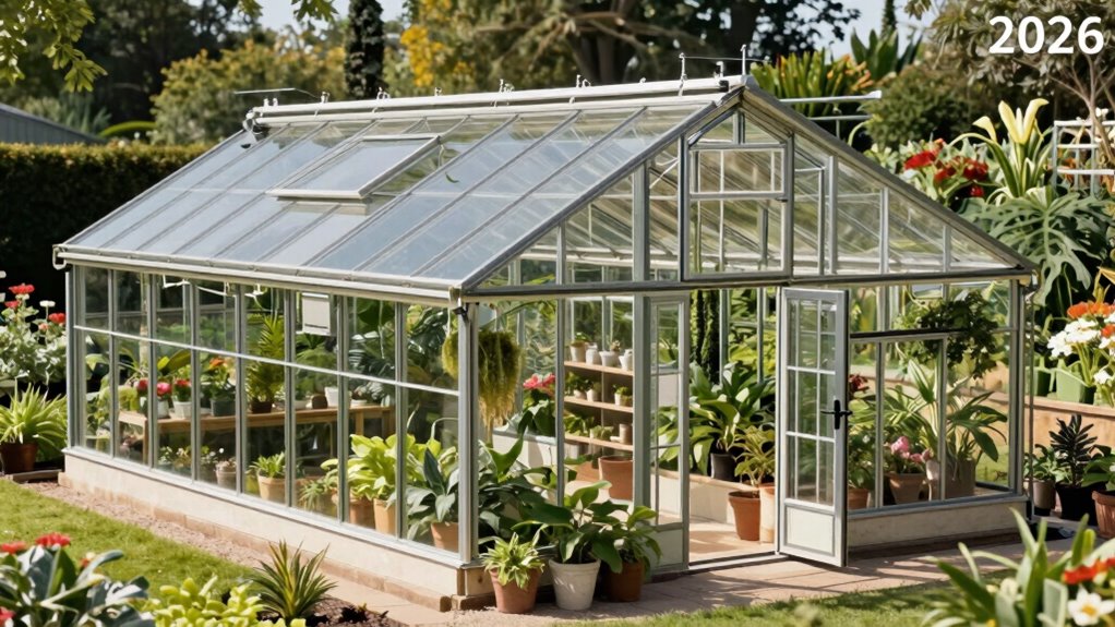 I recommend using aluminum for the frame because it’s lightweight, rust-resistant, and very durable, perfect for long-term use. For the panels, polycarbonate is my top choice due to its impact resistance and excellent thermal insulation, helping your plants stay cozy. Tempered glass is also a solid option if you want a more traditional look and extra strength. Overall, these materials warrant your greenhouse stays sturdy and lasts for years.