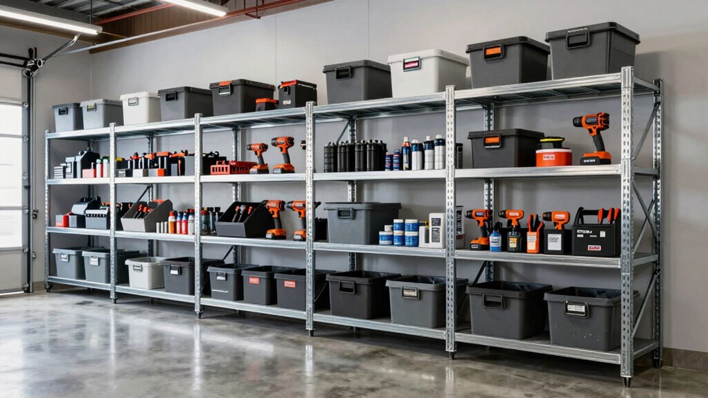 Think of adjustable shelves as the chameleons of garage storage—they adapt to your needs. Yes, they’re compatible with most heavy-duty units, allowing you to tailor your space effortlessly. I’ve found that their versatility transforms cluttered chaos into organized harmony. Whether you’re stacking tools or storage bins, these shelves flex with you, making your garage feel like a well-orchestrated symphony instead of a disorganized jumble.