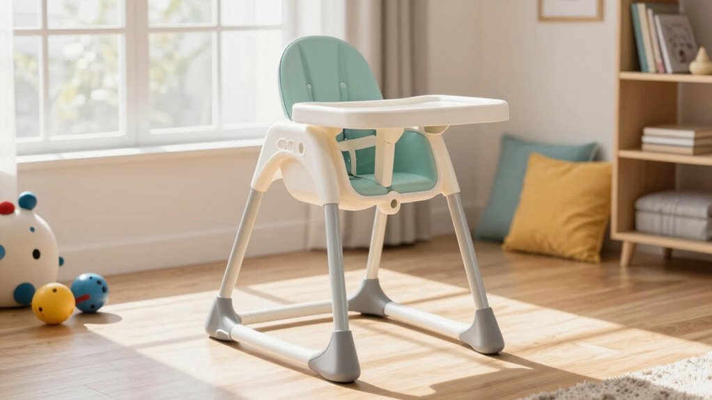 Since comfort plays such a essential role in keeping my child happy and settled, I prioritize high chairs with adequate cushioning that offers a cozy seating experience. Soft, padded seats help reduce pressure points and support longer sitting periods, making feeding and playtime more relaxed. I look for cushioning materials that are hypoallergenic, breathable, and easy to clean, ensuring safety and hygiene. Adjustable or removable cushions are a bonus, as they let me customize the fit as my child grows. High-quality padding with enough thickness also absorbs shocks and prevents discomfort during movement or active play. Overall, choosing a chair with the right cushioning helps my child feel secure and comfortable, making every mealtime enjoyable and fuss-free.
