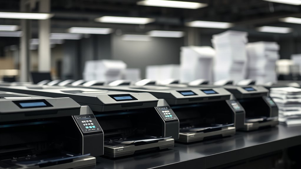 Choosing a high-speed document scanner means paying close attention to its processing speed and capacity, as these directly influence your workflow efficiency. Typically, these scanners process between 30 to 70 pages per minute, allowing rapid digitization of large volumes. Many models feature automatic document feeders that hold 50 to 100 sheets, enabling continuous scanning without frequent pauses. Duplex scanning, which captures both sides simultaneously, effectively doubles throughput, saving time. The scanner’s capacity, including input sheet limits and processing speed, impacts overall productivity—crucial in high-volume environments. To keep pace, many high-speed scanners incorporate features like multi-feed sensors and skew detection, ensuring smooth operation and high image quality without sacrificing speed. Prioritizing speed and capacity helps optimize your scanning workflow for maximum efficiency.