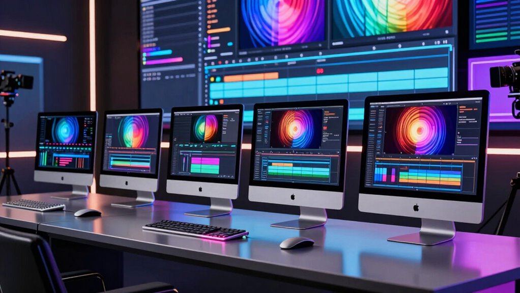 Choosing a Mac Studio for video editing means ensuring it works seamlessly within the Apple ecosystem. Compatibility with macOS is key, as it guarantees smooth integration with other Apple devices and editing software like Final Cut Pro and Motion, boosting efficiency. Features like iPhone Mirroring and Handoff make transferring media and project files effortless, saving time and reducing hassle. Universal Clipboard allows quick copying and pasting of clips across devices, streamlining workflows. Additionally, Apple’s focus on privacy and security protects sensitive project data throughout the editing process. This interconnected ecosystem not only enhances productivity but also provides a cohesive experience, making it easier to manage your entire editing setup within Apple’s environment. Ultimately, ecosystem compatibility is essential for maximizing your Mac Studio’s potential in video editing.