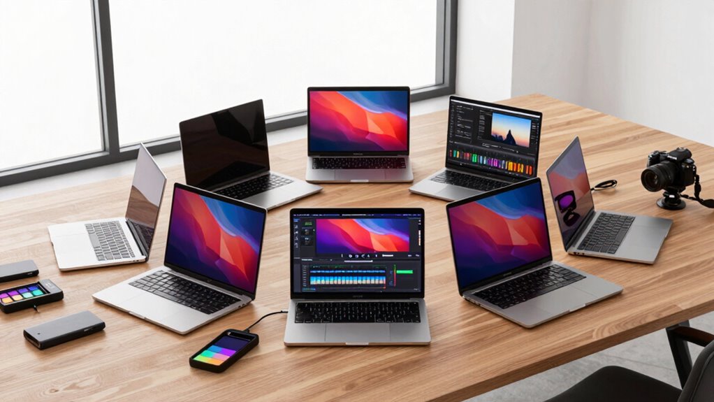 External connectivity options help you expand your workspace, but if you’re often on the move, battery life and portability become just as important. A long-lasting battery lets you work through extended editing sessions without constantly searching for an outlet. High-capacity batteries with up to 24 hours of video playback support uninterrupted workflows during long projects. A lightweight, slim design makes the MacBook Pro easier to carry and set up anywhere, enhancing your mobility. Keep in mind that smaller, more compact models might sacrifice some battery capacity, so you’ll need to balance portability with power needs. Quick-charging features are also a plus, allowing you to recharge rapidly and minimize downtime. Choosing a MacBook Pro that balances these factors ensures you stay productive wherever your editing takes you.