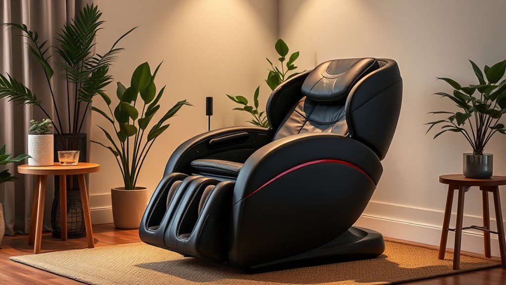 When choosing a massage chair for your home, it’s essential to pick a design that complements your interior style and enhances your space. Look for a model that matches your decor, whether it’s modern, classic, or minimalist. Consider the color and material—leather or fabric—that best align with your room’s aesthetic. A sleek, space-efficient model can fit comfortably without overwhelming the area. Prioritize ergonomic shapes with rounded edges and smooth contours, which not only look appealing but also add to comfort. The style should strike a balance between functionality and visual appeal, making sure it elevates your room’s overall ambiance. A well-chosen design can seamlessly blend into your home while providing a relaxing experience.