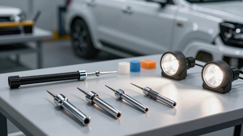 Choosing a paintless dent repair kit with the right tool versatility means guaranteeing it includes a range of tools like T-bar pullers, bridge pullers, and dent lifters to handle various dent sizes and shapes. Adjustable tools with variable width and height settings allow me to customize repairs for different vehicle surfaces and dent types. Including multiple puller tabs in various sizes ensures compatibility with dents of different depths and surface contours. A thorough kit should also support repairs on multiple surfaces, such as steel, aluminum, and even household appliances, maximizing usability. Auxiliary tools like LED dent lights and multi-functional repair aids further enhance repair accuracy and efficiency across diverse scenarios. Overall, a versatile toolkit saves time and expands repair capabilities, making it essential for professional success.