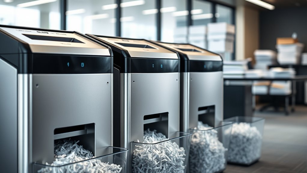 Safety features and overheat protections are vital considerations to keep your heavy-duty micro-cut shredder operating reliably. Overheat protection systems automatically shut off the shredder when internal temperatures get too high, preventing damage and extending its lifespan. Many models include thermal sensors that pause operation after 30-60 minutes of continuous use, allowing the unit to cool down. Overload protection detects jams or excessive paper loads, reversing the motor to prevent burnout or mechanical failures. Some shredders even feature LED indicators or alarms that alert you to overheating or overload conditions, ensuring safe operation. To maximize safety and efficiency, regular maintenance like cooling cycles and avoiding shredding metallic objects are essential. These protections give me confidence that my shredder will perform well and last longer.