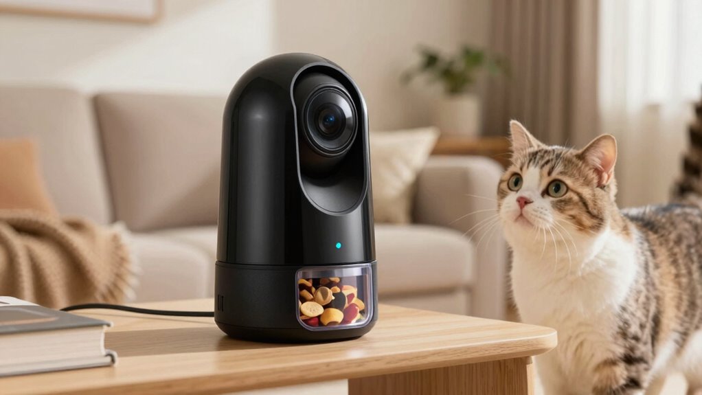 If you’re looking for the best pet cameras with treat dispensers in 2026, I recommend options like WaggleCam, Furbo Mini 360°, and Petcube Bites 2 Lite, which offer high-resolution video, wide angles, auto-tracking, and interactive features. These cameras also support remote treat dispensing, two-way audio, and secure storage, giving you peace of mind. Stay with me, and I’ll share more detailed insights on choosing the perfect device for your pet’s needs.