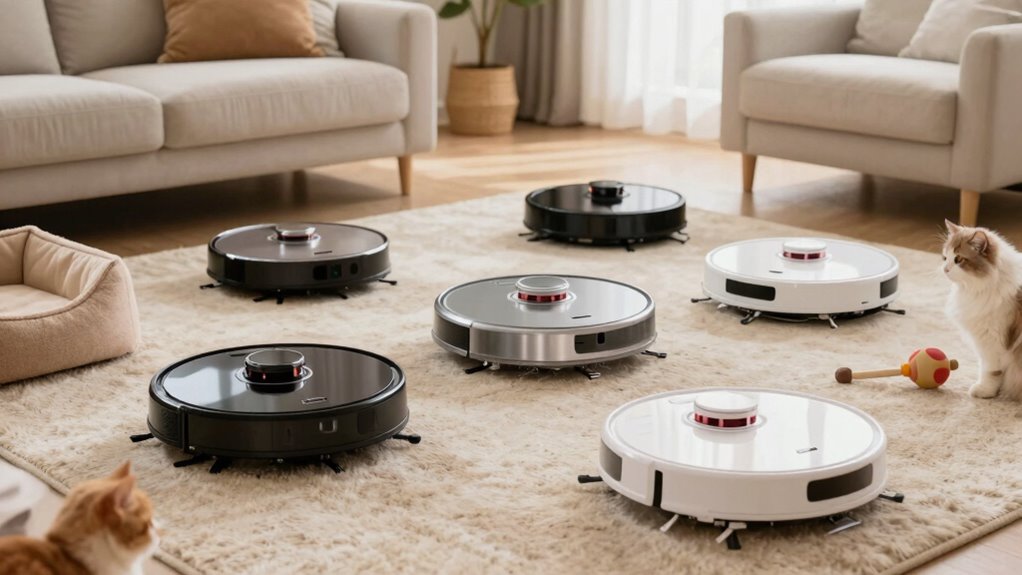 If you’re searching for the 15 best-rated robot vacuums for pet hair in 2026, I recommend models with strong suction (at least 5,000Pa), advanced navigation like LiDAR, and self-emptying features that keep maintenance minimal. Many top options also offer effective pet hair pickup, allergen filtration, and smart control options. Staying ahead means choosing a device that combines power, precision, and convenience—if you’d like, I can share more about the best picks for your home.
