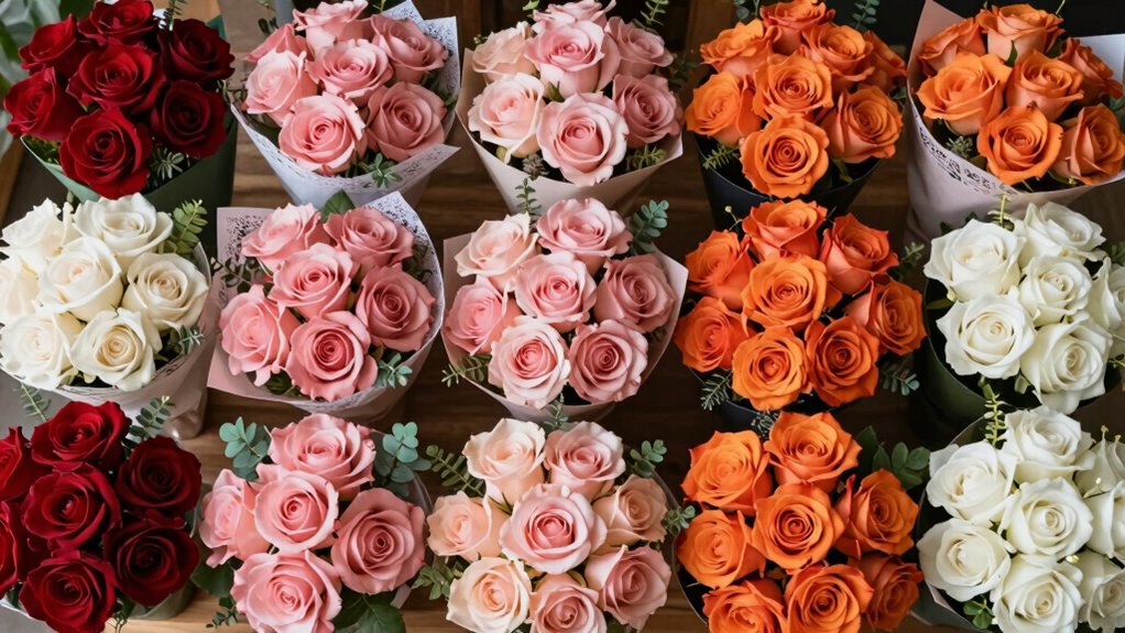 When selecting a rose bouquet, I always consider the flower quality and type to guarantee freshness and beauty. I also think about the color’s meaning and how it fits the occasion, along with the arrangement size and style. Finally, I keep my budget in mind to find a bouquet that’s perfect for the event without overspending.