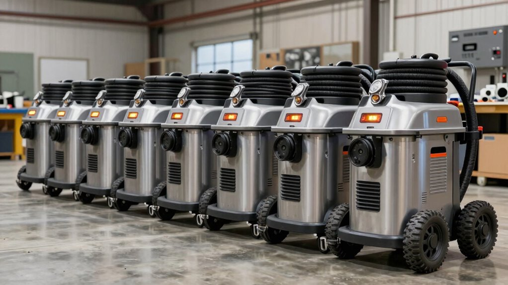 Choosing a shop vac with sufficient power is essential for tackling tough cleaning jobs, especially in heavy-duty settings. A strong motor, often measured in peak horsepower (HP), provides the suction needed to handle large volumes of wet and dry debris efficiently. Generally, heavy-duty models feature motors with at least 5 peak HP, ensuring robust performance. Higher wattage motors typically translate to increased airflow and better debris removal. It’s also important that the motor is durable, designed for frequent, intensive use, and equipped with advanced cooling systems to prevent overheating. This not only maintains ideal performance but extends the vacuum’s lifespan. In essence, a powerful motor guarantees that your shop vac can meet the demands of heavy-duty cleaning without faltering.