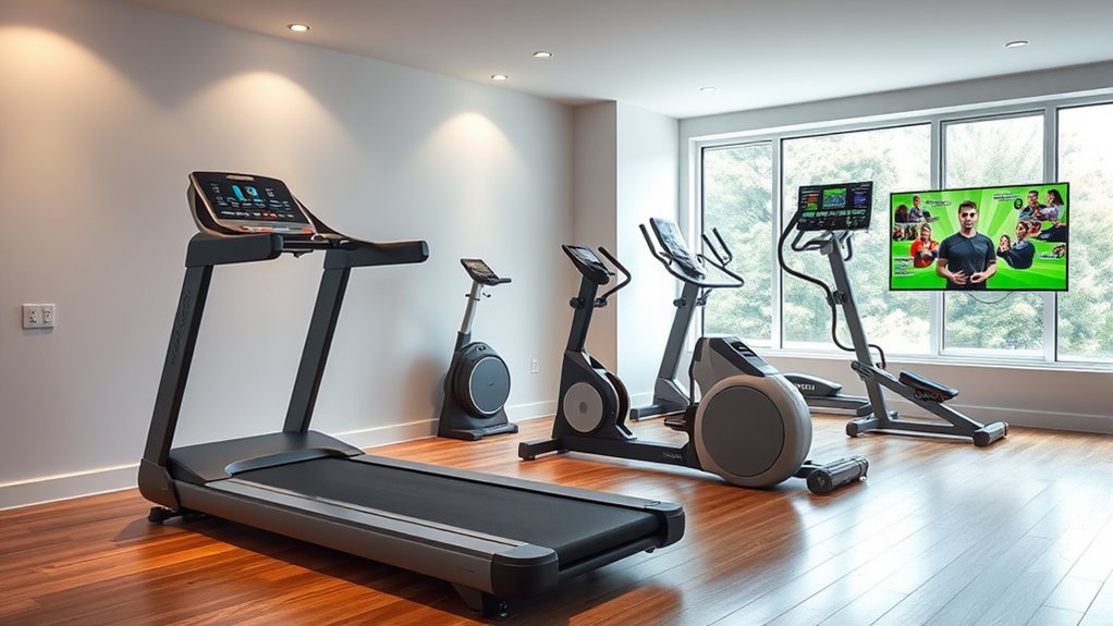 When choosing a smart home gym machine, safety features are just as vital as tech integration. I look for systems like imbalance detection and speed monitoring that help prevent accidents during intense workouts. Built-in weight safety systems ensure my movements stay secure and controlled, reducing injury risk. Emergency stop functions or quick-release mechanisms are essential, allowing me to halt exercises immediately if needed. Adjustable safety bars or guards provide extra protection during heavy lifts or high-resistance sessions. Automated safety protocols, such as automatic brake engagement or resistance limits, add an extra layer of security, giving me peace of mind. These features ensure I can focus on my workout without constantly worrying about potential hazards, making my home gym safer and more reliable.