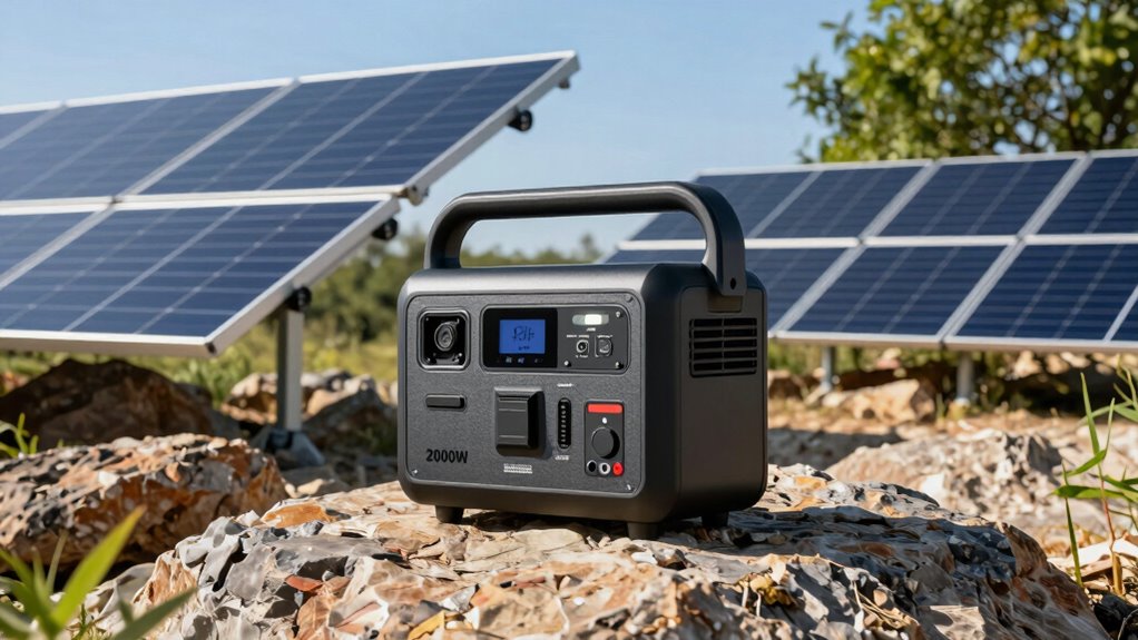 Fast charging options are essential when selecting a 2000W solar generator, as they determine how quickly I can restore power during outages or outdoor activities. With the ability to reach 80% capacity in just 36 minutes via AC power, I can minimize downtime effectively. Combining solar and AC inputs allows me to fully recharge in about 50 to 80 minutes, depending on system efficiency. Support for multiple charging methods—solar, AC, car, and generator—adds flexibility, ensuring I can recharge quickly in various scenarios. High input wattage, between 800W and 2200W, accelerates the process, reducing waiting time. Additionally, adjustable charging settings and intelligent input management optimize recharge speeds based on the power source and environmental conditions, making speed a key factor in my choice.