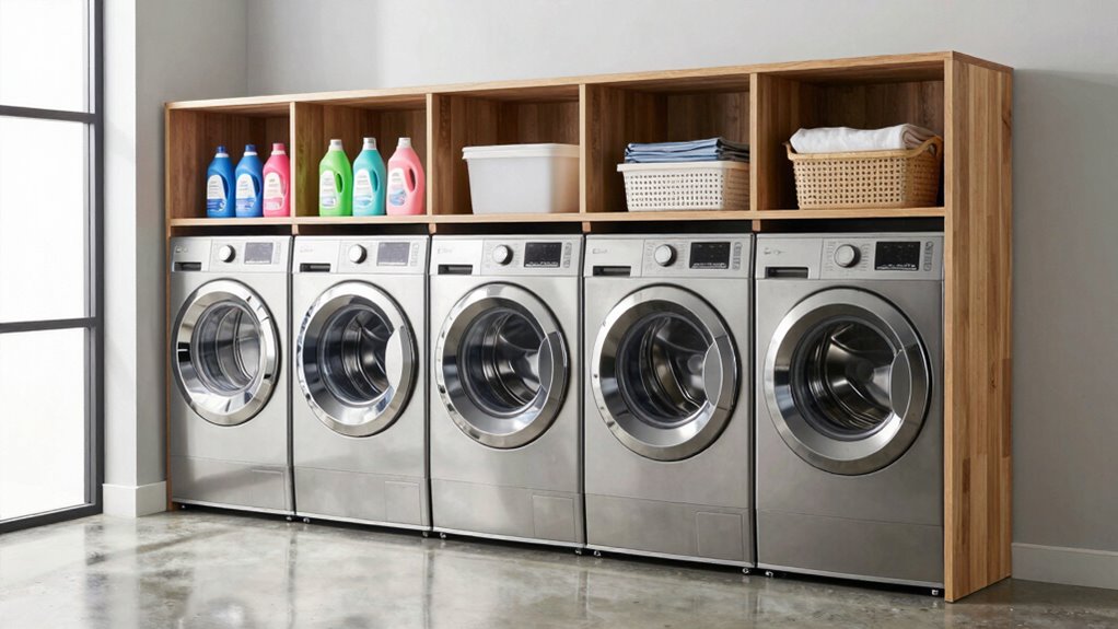 I find that metal, especially stainless steel, is the most durable material for washer dryer shelves because it resists moisture, rust, and corrosion. Solid wood with a waterproof finish also works well, providing strength and a polished look. Avoid cheap plastics, as they tend to warp or break over time. Overall, choosing sturdy, moisture-resistant materials guarantees your shelves last longer and withstand everyday laundry use.