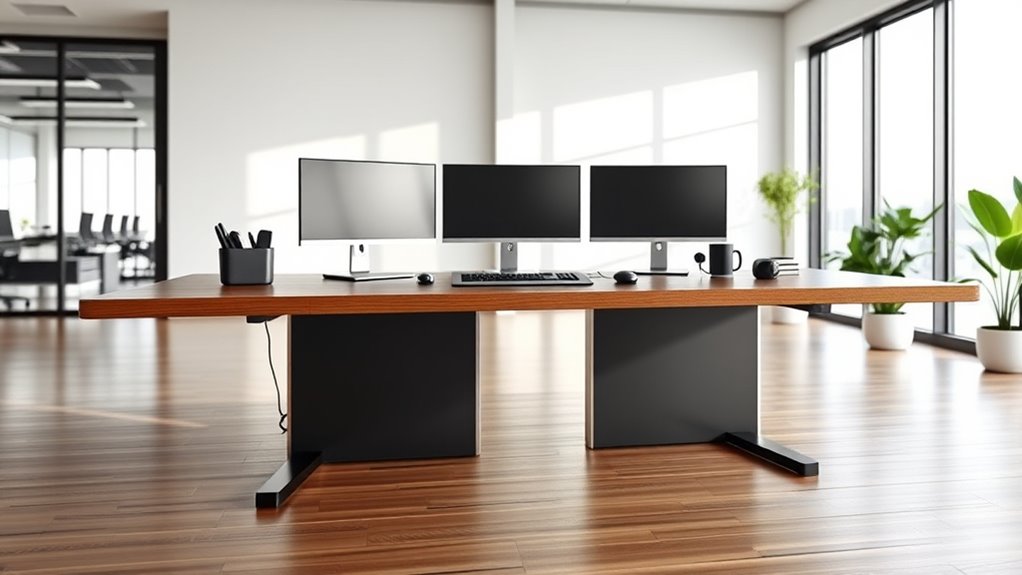 Extra-wide desk converters are surprisingly stable during height adjustments when built with quality materials and sturdy mechanisms. I’ve found that most high-end models feature robust support systems, like reinforced frames and smooth, lockable height controls, which prevent wobbling. As long as I choose a reputable brand and guarantee proper setup, I feel confident that my converter remains stable and secure, even when I’m typing or reaching across multiple monitors.