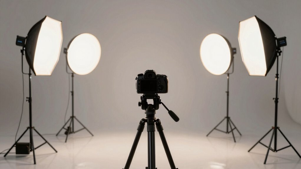 When evaluating a studio lighting kit, portability and size are essential factors that can make or break your setup experience. I look at the overall weight and dimensions to confirm I can easily transport and set up the kit across different locations. Compact, foldable softboxes and adjustable tripods that disassemble for packing are game changers. I also check the included carrying cases or bags for durability and capacity, making sure all components stay secure during transit. Lightweight yet sturdy stands and accessories are important, especially if I need to move them frequently. Modular lighting systems with adjustable height and collapsible parts maximize portability without sacrificing performance. These considerations help me create flexible, efficient setups, whether I’m shooting in a studio or on location.