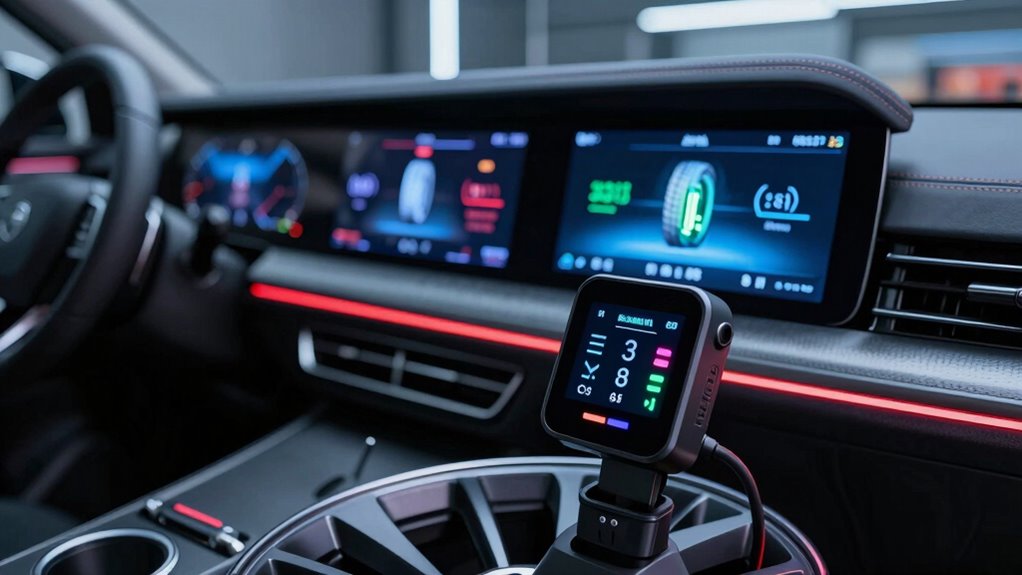 Selecting the appropriate TPMS involves confirming that it supports your particular vehicle type, whether it’s a sedan, SUV, RV, trailer, or truck. Different vehicle types have distinct requirements, so I always check if the system is compatible with my vehicle’s size and configuration. I also verify that it can accommodate my tire pressure ratings, making sure the system’s maximum pressure matches or surpasses my tires’ specifications. External sensors must fit my valve stems, whether metal or rubber, to create a proper seal. For larger vehicles like RVs or trailers, I confirm that the system’s monitoring range and sensor signal strength are sufficient. Finally, I guarantee the TPMS supports the total number of tires on my vehicle to provide thorough coverage and dependable monitoring.